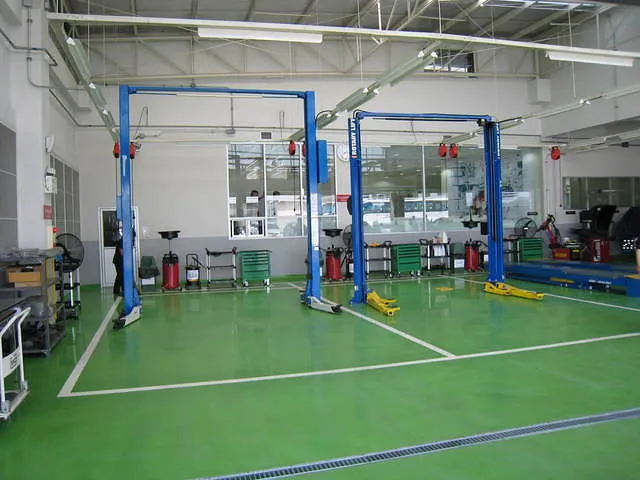 三階建社屋、一階専有面積すべてを整備工場としており、広大な工場では6基のリフトが常時稼働しております。リフトでお客様のお車を持ち上げて下から点検。